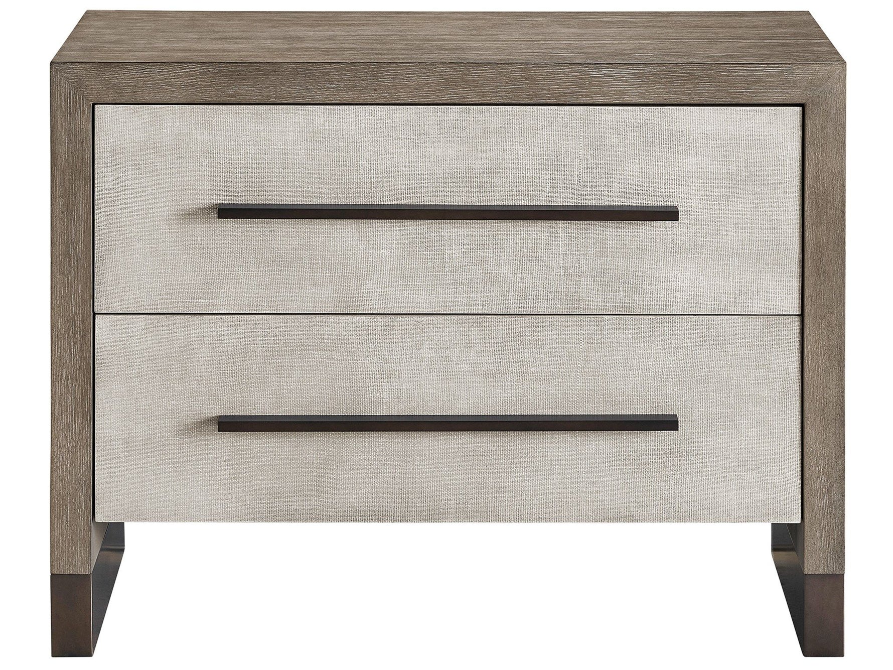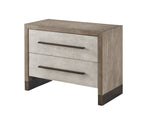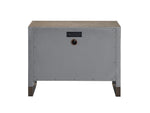 Unit price perTwo spacious drawers with lightly textured faux linen drawer fronts are encapsulated by a weathered oak finish and outfitted with USB ports and outlets.