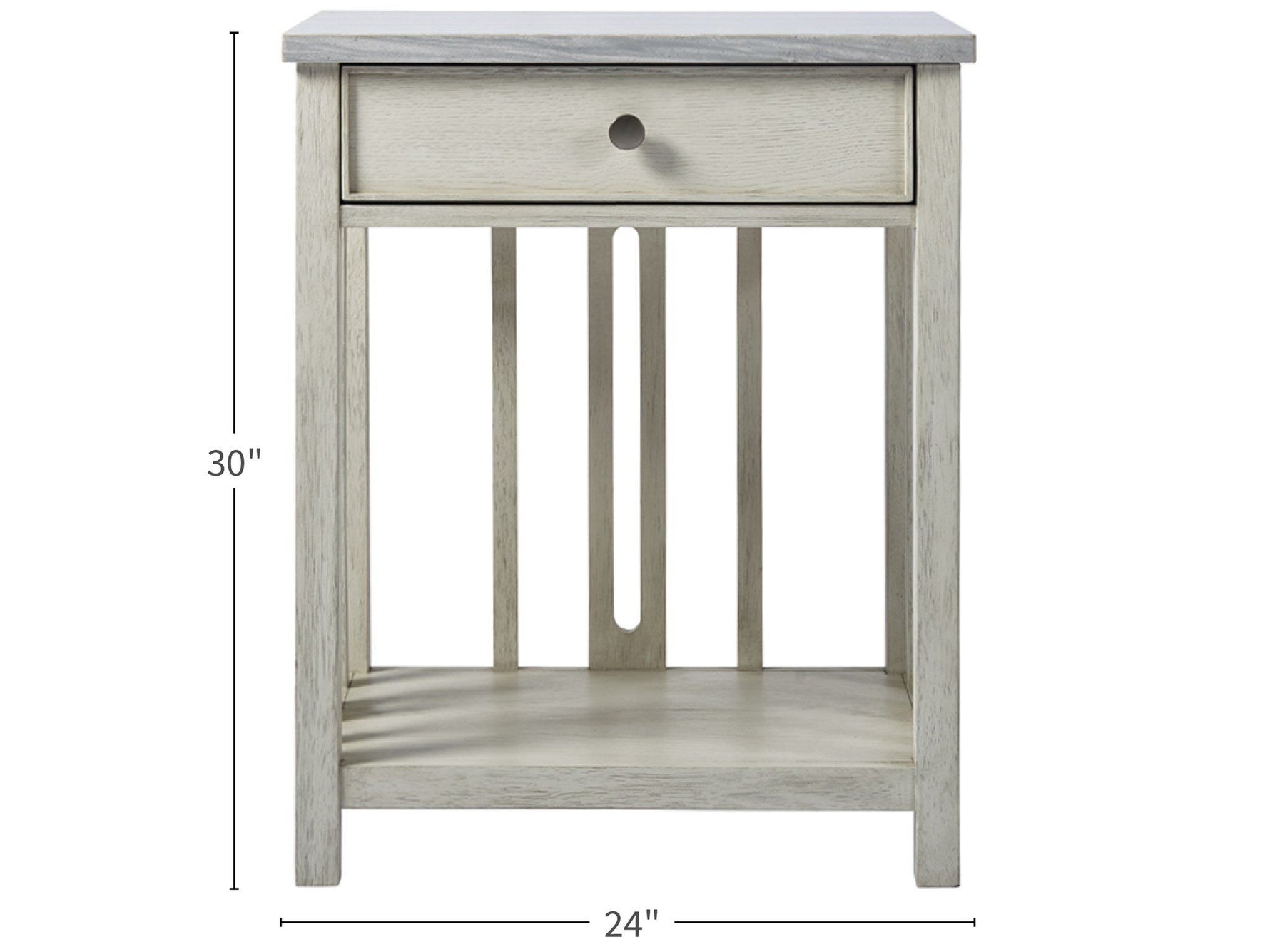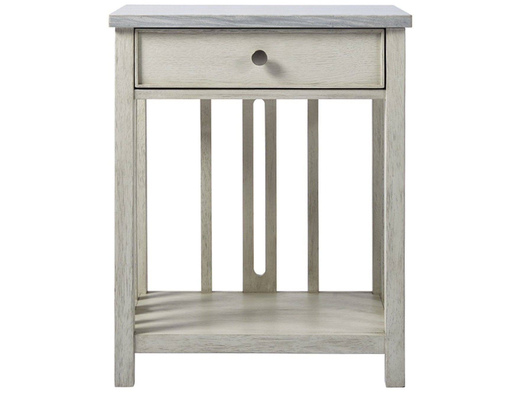 Artfully combining textures and tones, the Escape Bedside Table with Stone Top features one storage drawer, an open-air display shelf, and relaxed linear detailing.