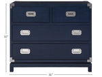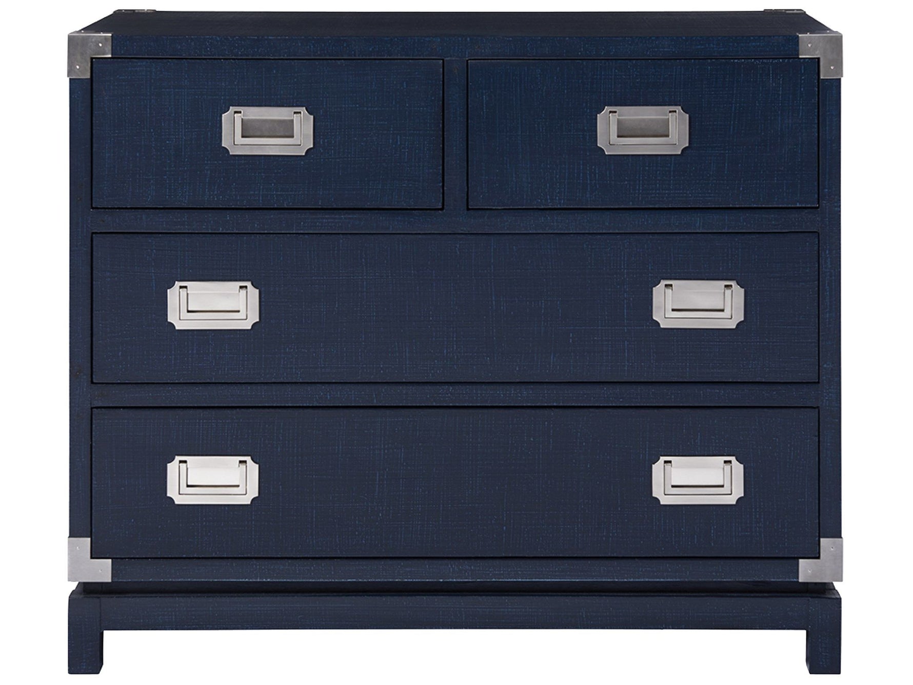 A stunning Marina finish and a vintage trunk-inspired frame define the Coastal Campaign Chest, a bold accent piece built with four drawers and chic inset hardware.
