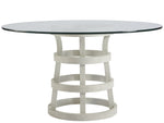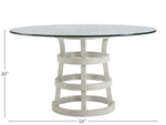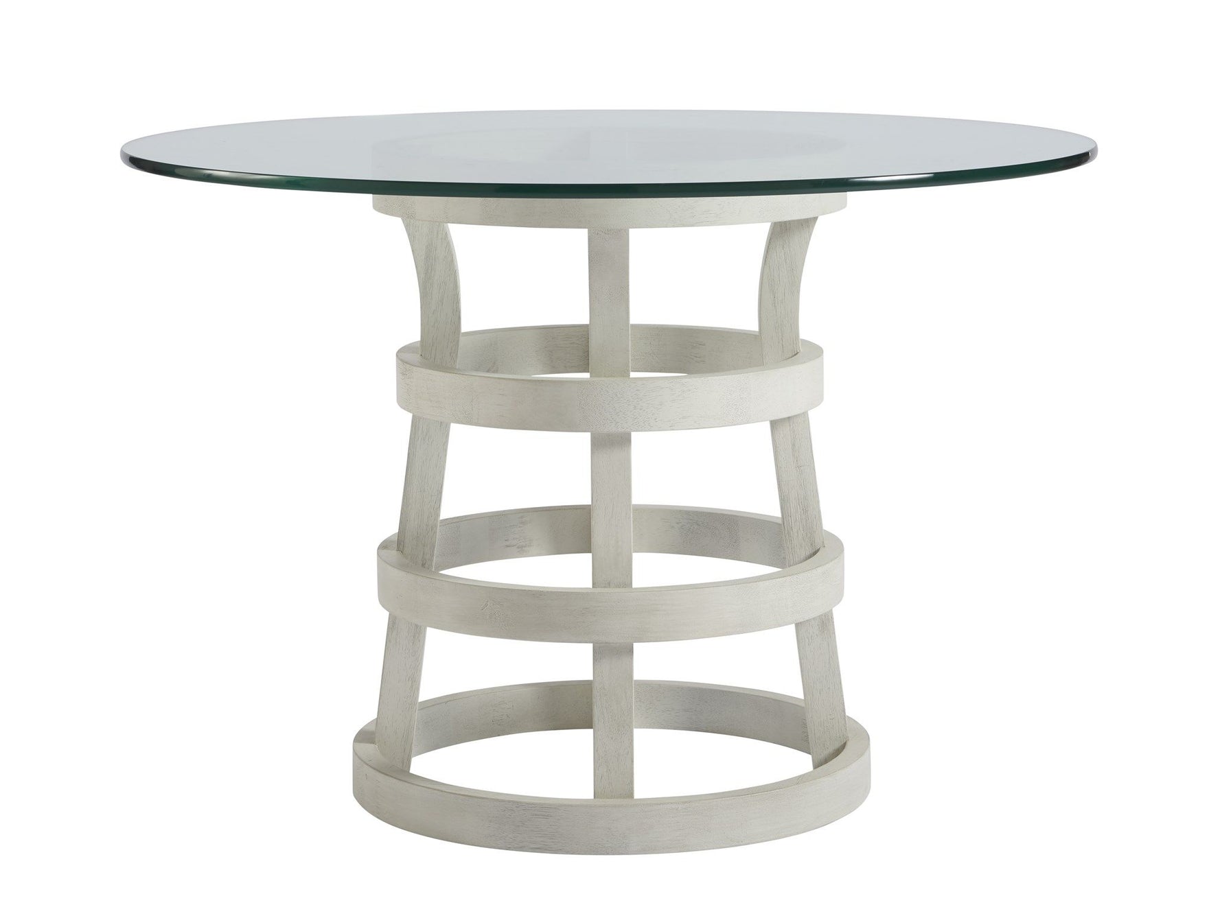 The Escape Dining Table creates a joyfully light focal point in spaces with a circular glass top supported by a unique, open-air base design in a smooth finish.