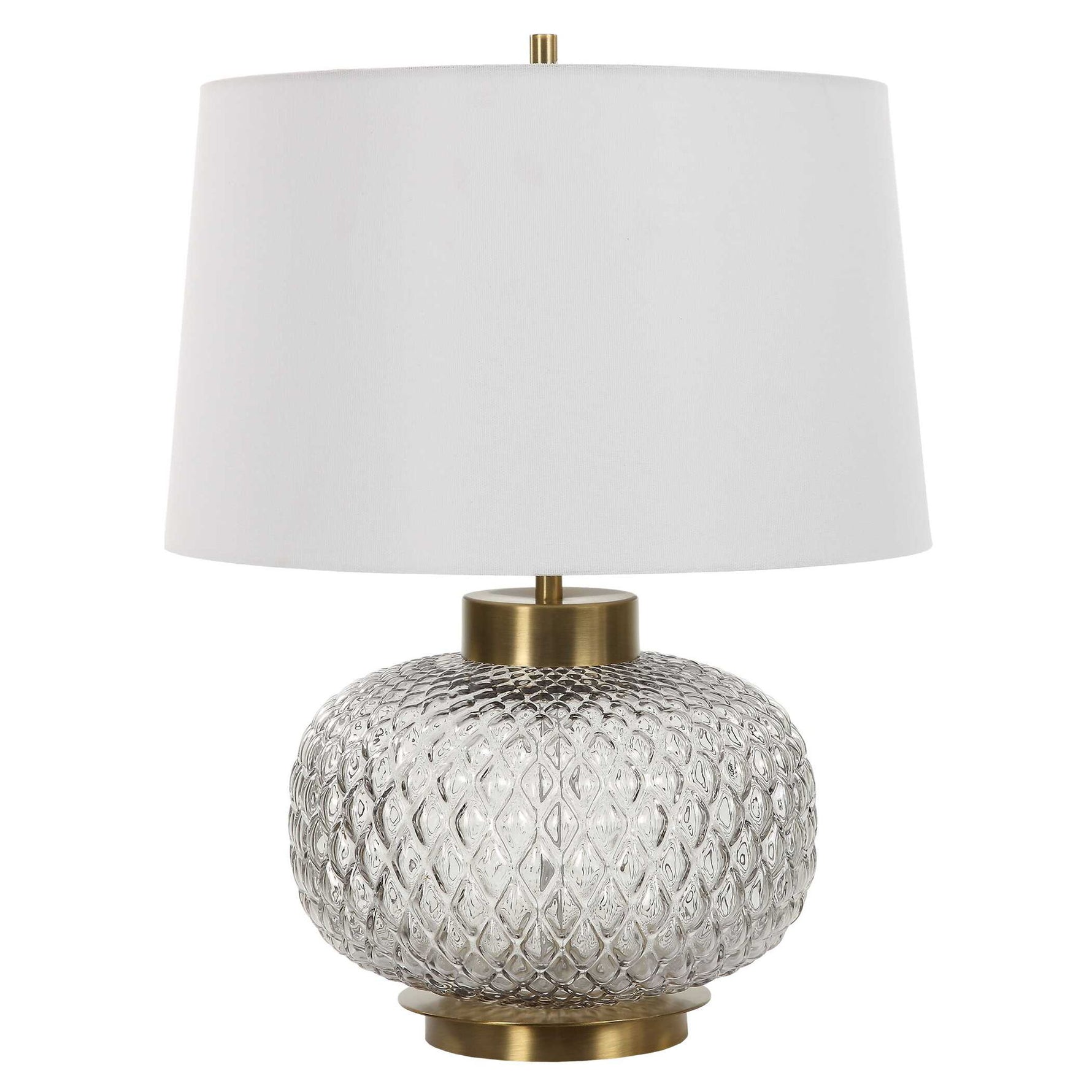 - The Estelle Table Lamp Features A Heavily Embossed, Round Lattice Inspired, Light Smoke-gray Glass Base Accented By A Chunky Antique Brass Foot And Hardware.