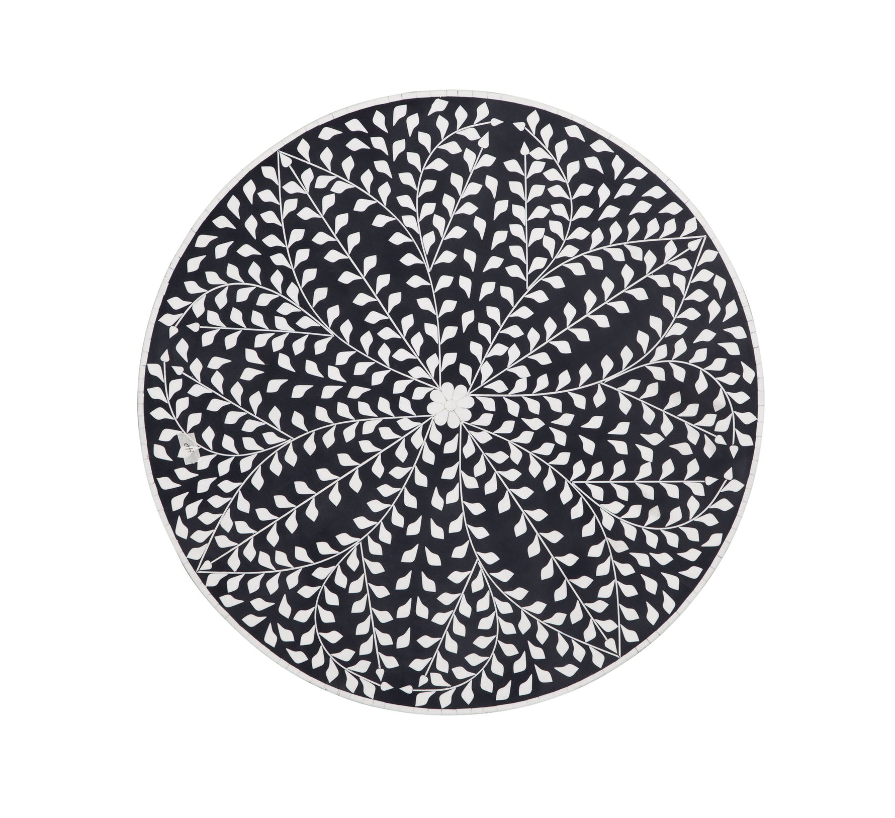Everlasting Wall Art is a wooden round wall hanging with a black and white mosaic like floral design.