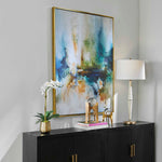 Giclee On Canvas, This Abstract Piece Features Blue, Teal, Yellow And Orange Colors Highlighted By Off White Accents. A Solid Wood Gallery Frame With Gold Finish Completes The Artwork. May Be Hung Horizontal Or Vertical. Each Canvas Is Proudly Handcrafted And Printed In The USA. Artwork By Leah Rei.