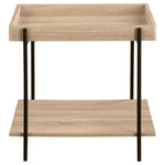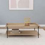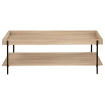 Offer a casual ambiance to your living room gathering space with a modern farmhouse table, constructed from metal and engineered wood. It showcases a light wood grain finish, creating a sense of dimension while maintaining neutral versatility. The tabletop is rectangular, with a tray-like top that adds detail and natural wood-like features. A minimal metal framework receives a black finish and offers structure and support. Underneath, a full, flat lower shelf provides convenient storage or display space for books and decor, lending personalized appeal to your living room.