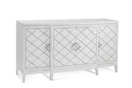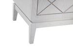 - Features silver routed diamond pattern with complementing hardware over a white flat cut oak veneer finish