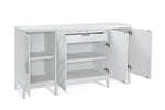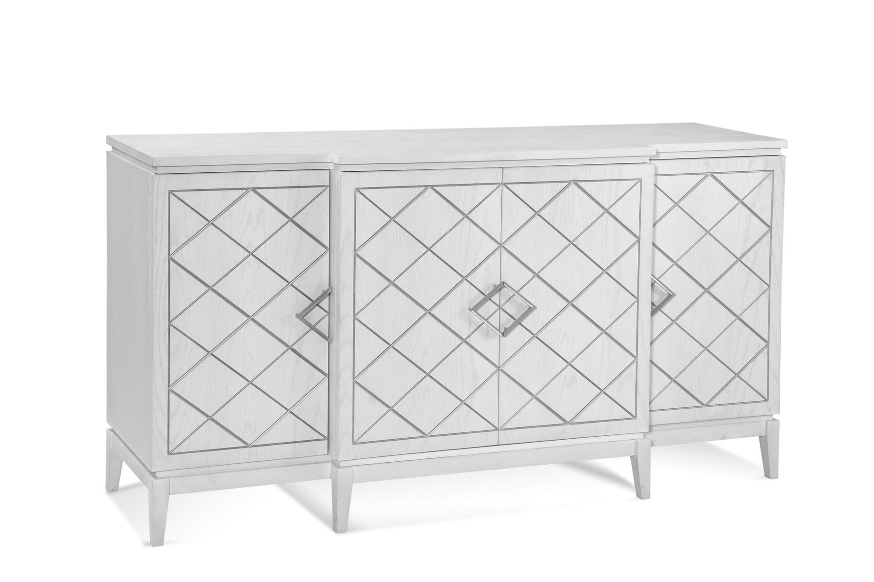 The Farrow Server features four doors with three adjustable shelves and one drawer on full extension side glides . The server is constructed with rubberwood solids and flat cut oak veneers in a clean white stain and features a geometric routed pattern on the door fronts with a champagne finish accents and custom diamond shaped hardware. Other features include soft close hinges, adjustable floor levelers and media cable management cutouts.