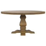 Create a warm and inviting space for family meals with a traditional dining set. It centers on a stylish wooden dining table with a round top. Its decorative pedestal and finish create a stylish look and feel, perfect for a refined home. The set includes upholstered side chairs, each with a tall back for impeccable comfort and support. Fabric upholstery is stylish but neutral enough to complement in any setting, while button tufting adds classic dimensionality.