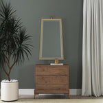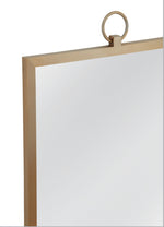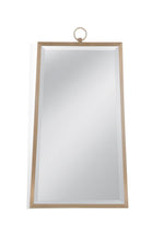 The Floris Wall Mirror is a rectangular shaped beveled mirror with a center ring finial in a brushed gold finish.