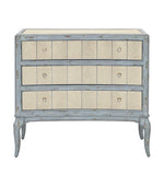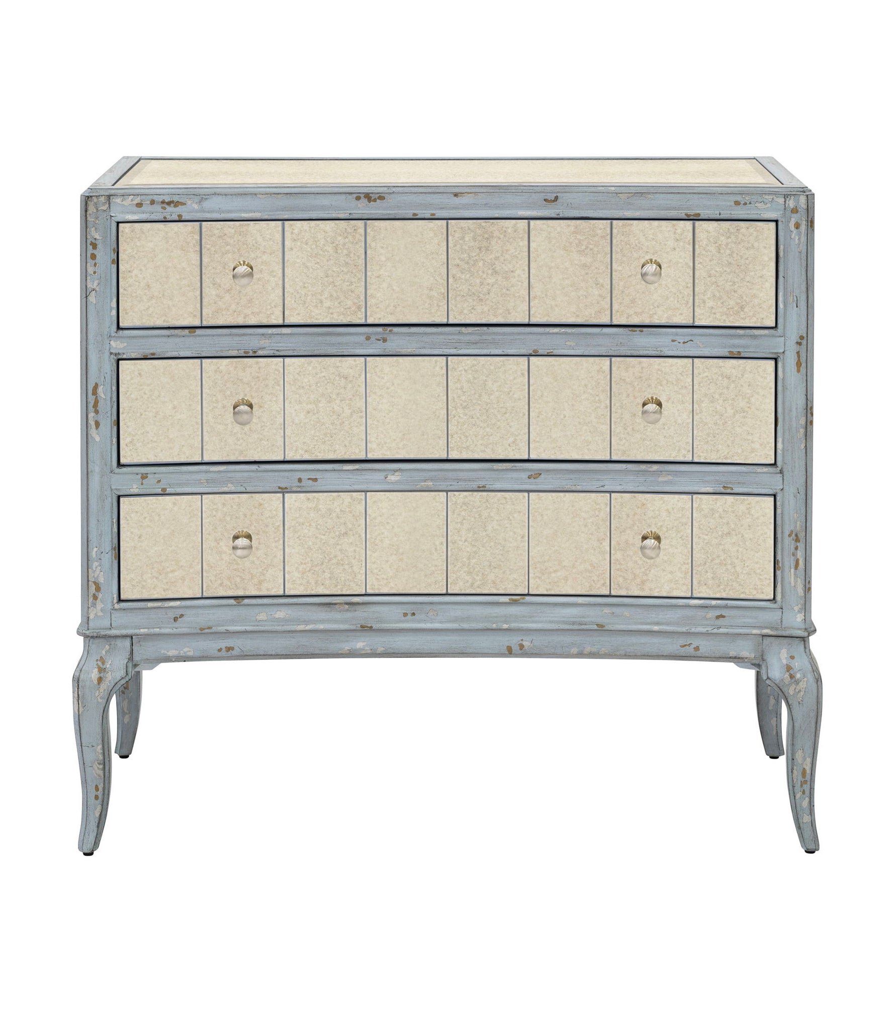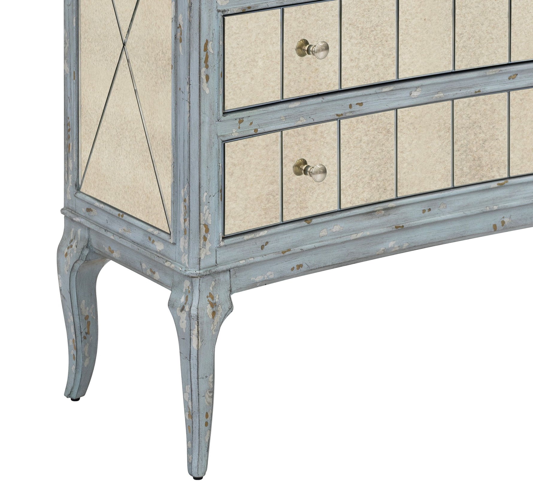 The Fontaine Hall Chest beautifully combines farmhouse charm with a hint of glamour. Its heavily distressed robin's egg blue finish is enhanced by antiqued mirror accents on the drawer fronts, end panels, and top. Featuring three spacious storage drawers, this piece offers both practicality and style. Supported by elegant cabriole-style legs, it adds a touch of sophistication to any entryway or living space. Embrace the perfect blend of rustic and refined with this stunning hall chest.