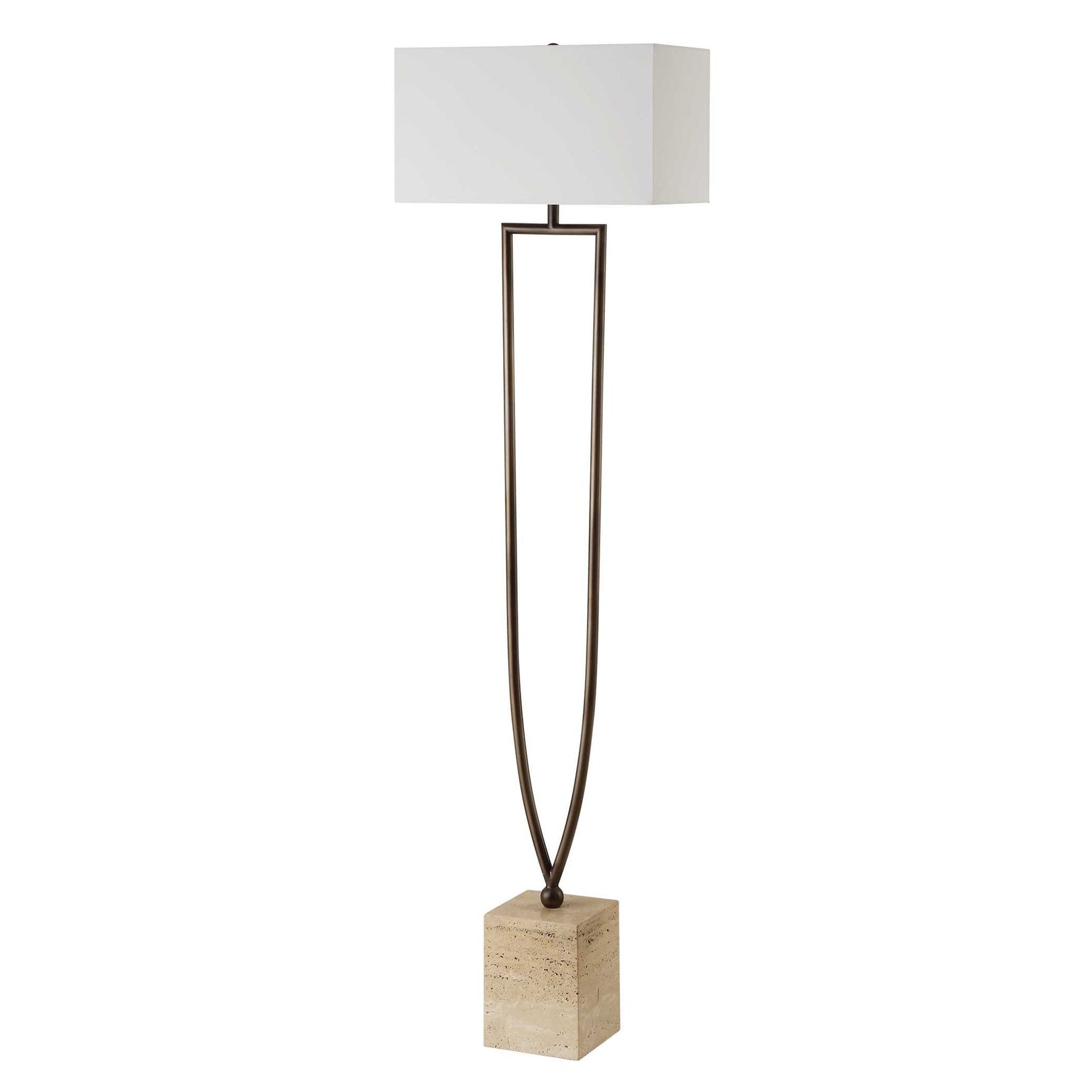 This Floor Lamp Features A Unique Split Iron Column Finished In A Warm Dark Bronze, Displayed On A Substantial Block Of Beige Travertine. The Rectangle Drum Shade Is Covered In A Causal White Linen Fabric.
