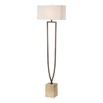 - This Floor Lamp Features A Unique Split Iron Column Finished In A Warm Dark Bronze, Displayed On A Substantial Block Of Beige Travertine.