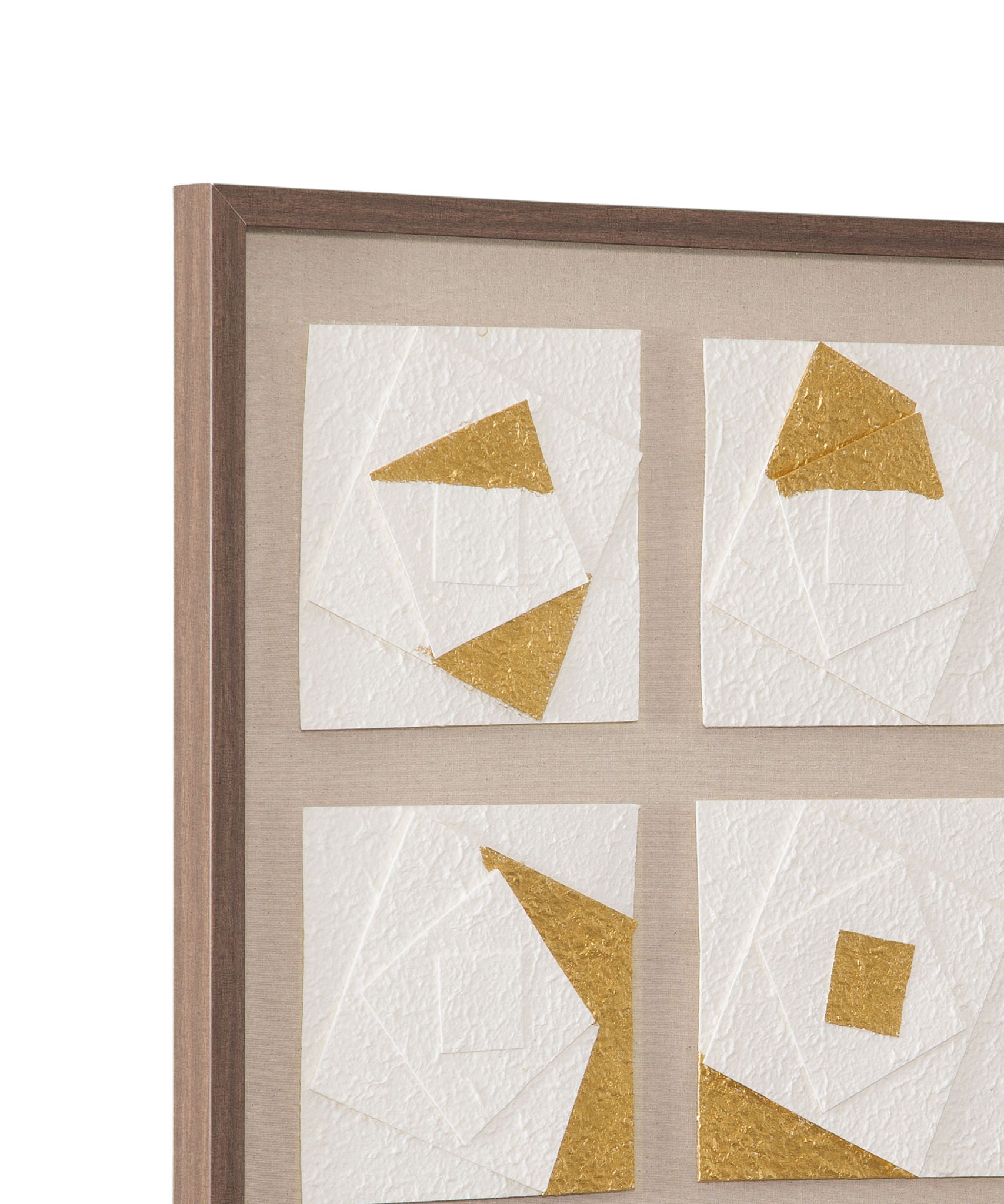 The Framework Wall Art features a modern shadowbox style design, combining a neutral linen background with nine 3D square abstract pieces. The striking white and gold accents of the pieces create a bold contrast, adding depth and visual interest to the artwork. The brown frame complements the design, providing a natural and grounding touch. This piece effortlessly blends contemporary aesthetics with artistic sophistication, making it a perfect addition to a variety of interior spaces.
