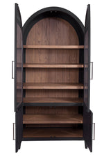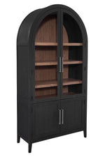 The Fynn Display Cabinet features a seamless fusion of modern and traditional styles. Crafted from solid wood and flat cut oak veneers, this piece showcases a sophisticated two-tone finish. The matte black oak exterior exudes contemporary charm, while the light natural oak interior adds a touch of classic elegance. The cabinet features two arched oversized doors on top, revealing three adjustable shelves for perfect display. Below, a single adjustable shelf with antique nickel finished bar pulls offers both functionality and style.