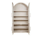 The Fynn Light Oak Display Cabinet beautifully merges modern and traditional design elements. Constructed from solid wood and flat-cut oak veneers, it features a refined cerused grey-oak finish. The cabinet showcases two arched, oversized doors that open to reveal three adjustable shelves, perfect for showcasing your favorite items. Below, a single adjustable shelf provides additional storage, elegantly accented by antique nickel-finished bar pulls. This versatile piece adds both style and functionality to any room.