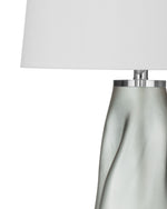 The Gabon Table Lamp is crafted of art glass with a white linen tapered shade. Finish: smoke. The hand-crafted details produced by a skilled artist lends itself to a unique technique and will vary slightly.
