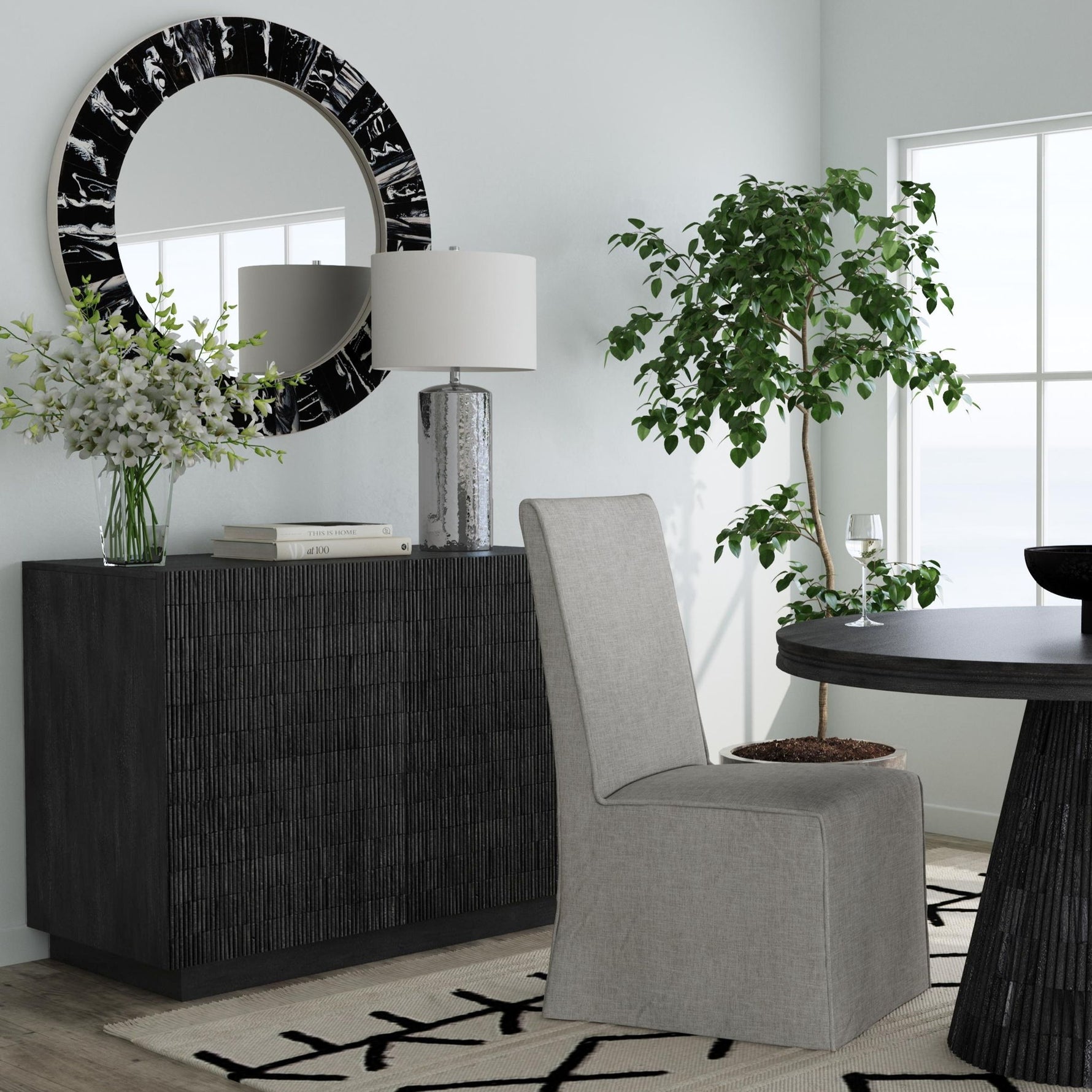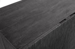 The Gaines Server features a Rustic Modern inspired design. Constructed with a sandblasted solid mango and finished in a deep, charcoal black. This large cabinet has two oversized doors and featuring a chiseled design element. Inside is a single fixed shelf and a media cord management cutout.