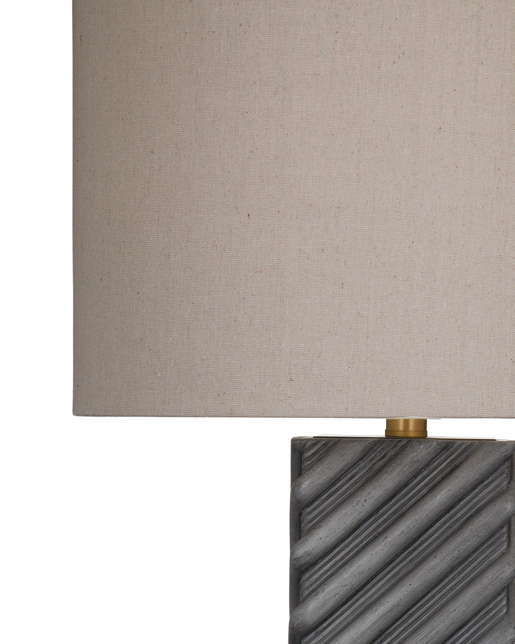 The Gannex table lamp features a gray cement base with brass accents and a tan drum shade. .