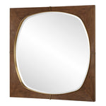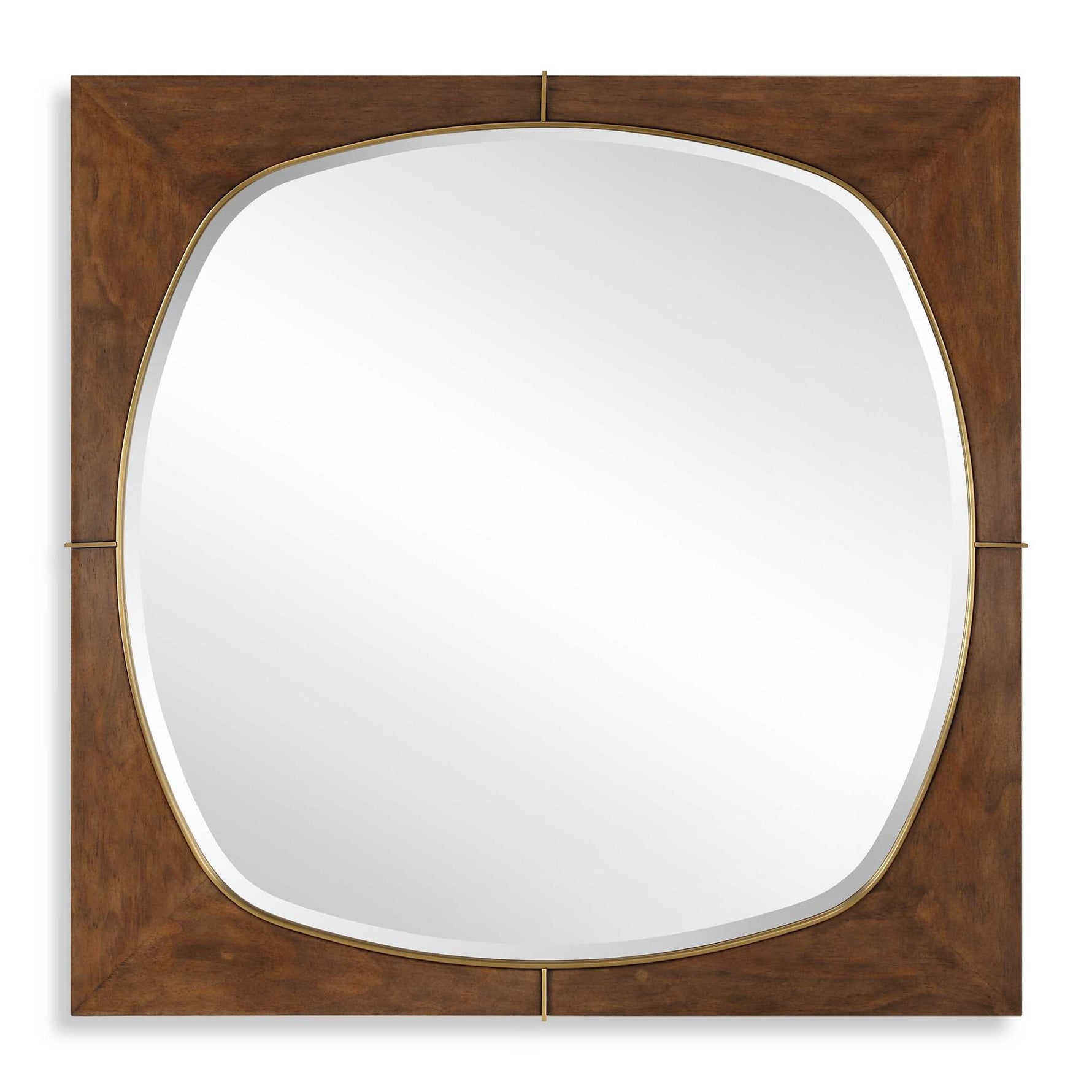 • The Garonne Square Mirror Features A Solid Pine Wood Frame, With An Antiqued Walnut Stain Wash. Its Profile Boasts A Subtle Slope For Added Allure, Complemented By Stainless Steel Details Finished In Plated Brass. The Mirror Has A Generous 1" Shaped Bevel.