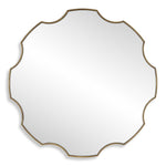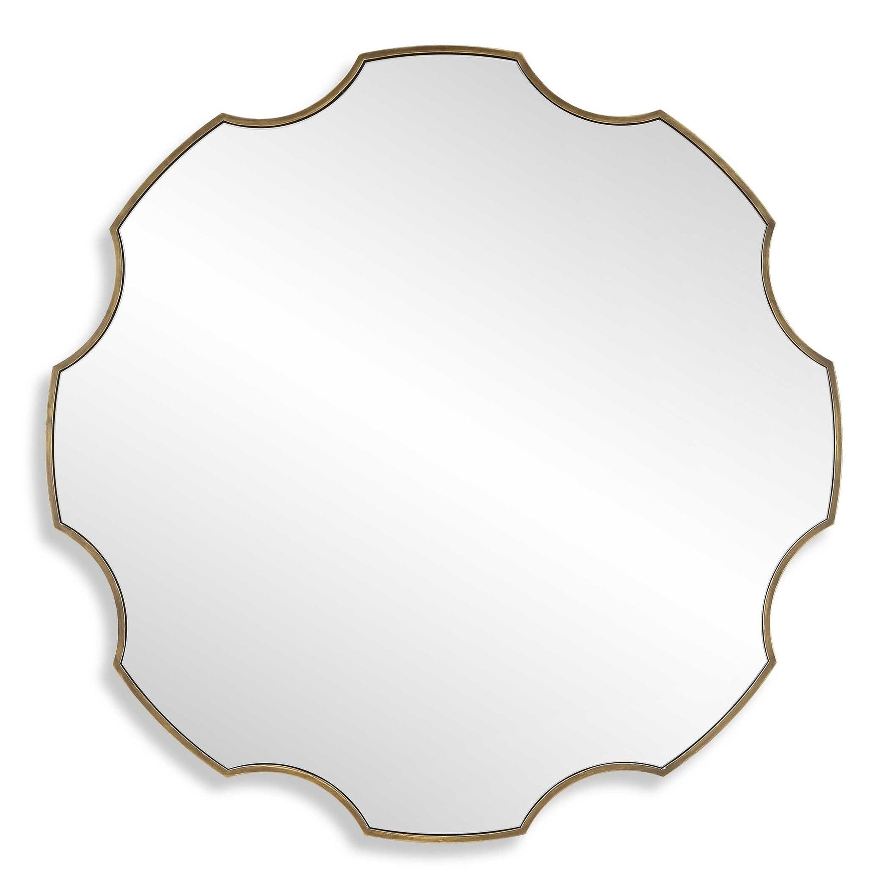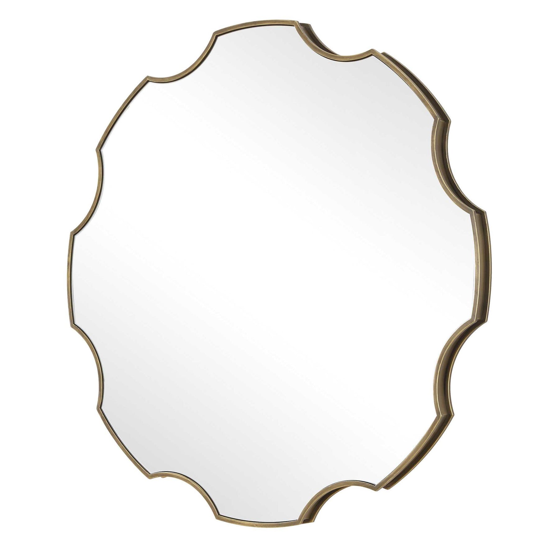 Our Gear-shaped Mirror Boast An Iron Frame With A Channeled Side And A Richly Antiqued Golden Bronze Finish. Its Distinctive Silhouette Encases A Floating Polished Edged Mirror, Creating A Blend Of Vintage Charm With Modern Allure.