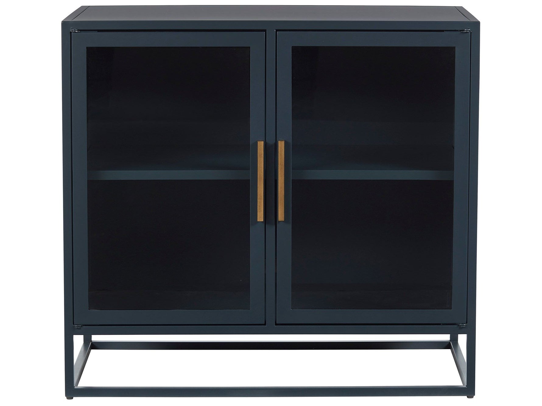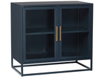 The striking Santorini Metal Kitchen Cabinet elevates interiors with calming seaside vibes, showcasing an alluring deep blue finish, clear glass doors, and sleek bronze bar hardware.