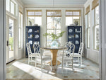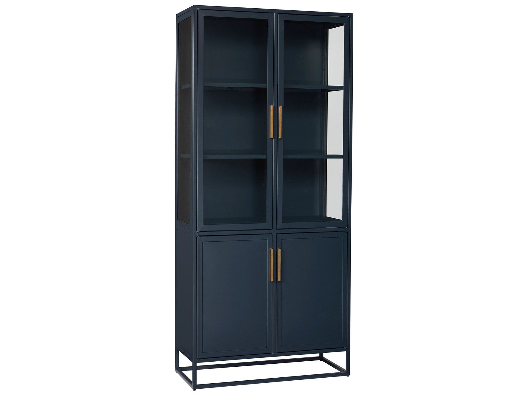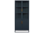 Add vertical storage to living areas with the Santorini Tall Metal Kitchen Cabinet, a serenely confident piece in a deep blue finish with clear glass doors and sleek bronze bar hardware.