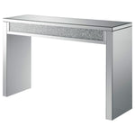 This mirrored console table features clean lines and a contemporary design, highlighted by a central inlay of sparkling acrylic crystals. The sturdy frame and smooth mirrored surfaces create a striking, modern aesthetic that elevates any room. The acrylic crystal accent is placed seamlessly within the design, adding a touch of glamour. With its sleek and minimalist structure, this console is perfect for entryways, living rooms, or hallways, offering both beauty and functionality.