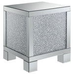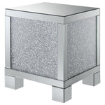 This 20-inch square mirrored end table brings a touch of glam to any space. Its engineered wood frame is adorned with shimmering acrylic crystal accents, adding sparkle and elegance. Fully mirrored surfaces enhance light and dimension, while the clean, square silhouette delivers sleek, contemporary style. Perfect as a functional or decorative piece, this table elevates your living room with luxurious glamor.