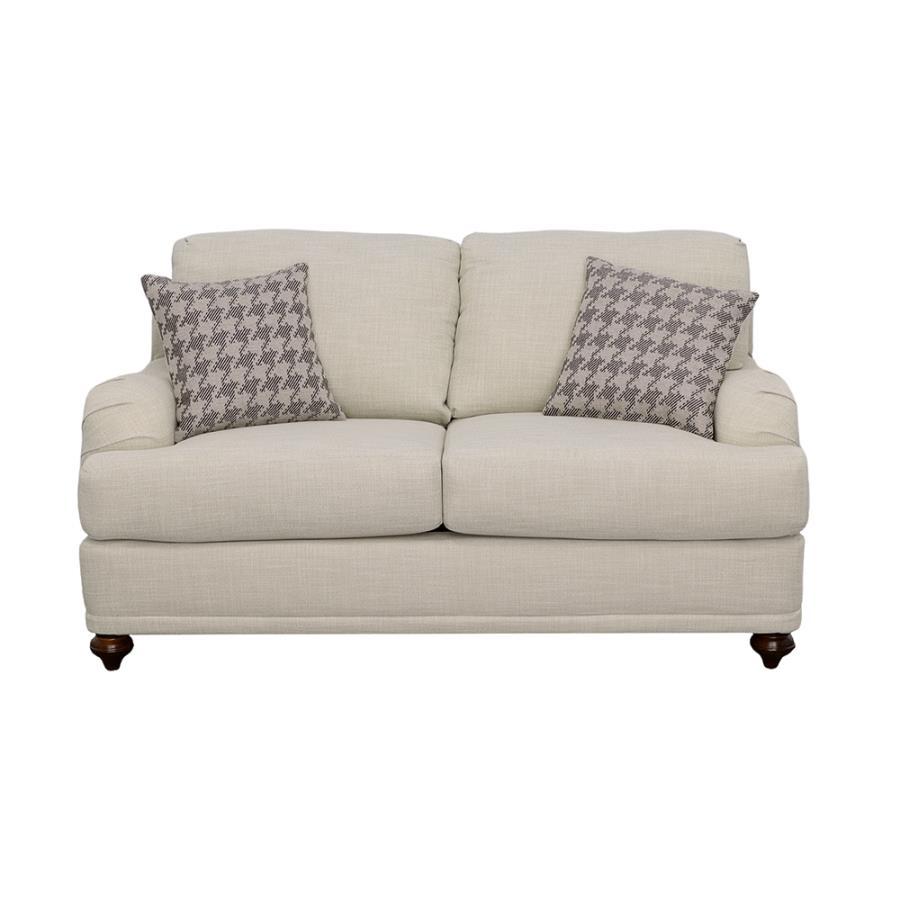 Give your living room or den a charming presence where friends and family feel at ease. This two-tone modern farmhouse loveseat helps confirm that everyone is always welcome. It features light grey linen-like reversible seat cushions, which help extend the life of your upholstery, and contoured armrests that are comfortable as they are alluring. The loveseat also boasts exquisite bun legs in a deep contrasting espresso finish. Accent pillows in complementary tones and patterns tie the entire design together.