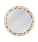 Global Wall Mirror is round, featuring natural colored bone with brass cladding accents.