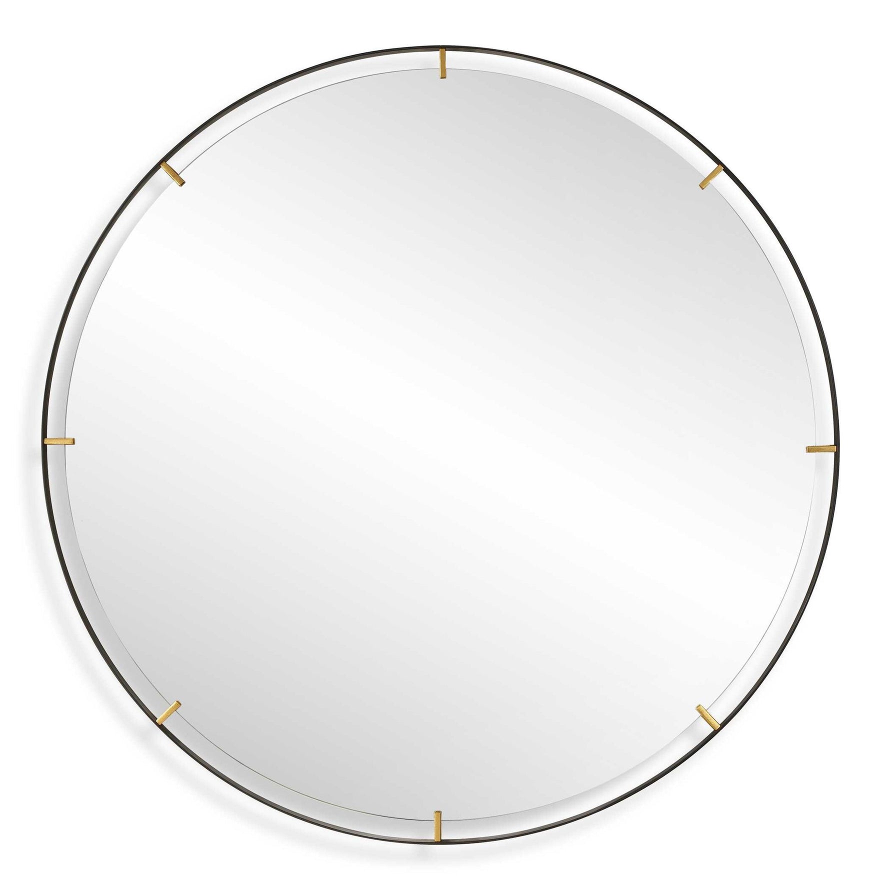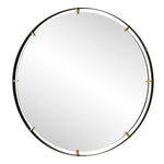 • Elevate Your Home Decor With Our Grand Pendulum Round Mirror. Crafted With A Hefty Black Iron Frame Accented By Lightly Antiqued Gold Clips That Help Suspend A Polished Edge Mirror For A Statement Piece In Any Room.