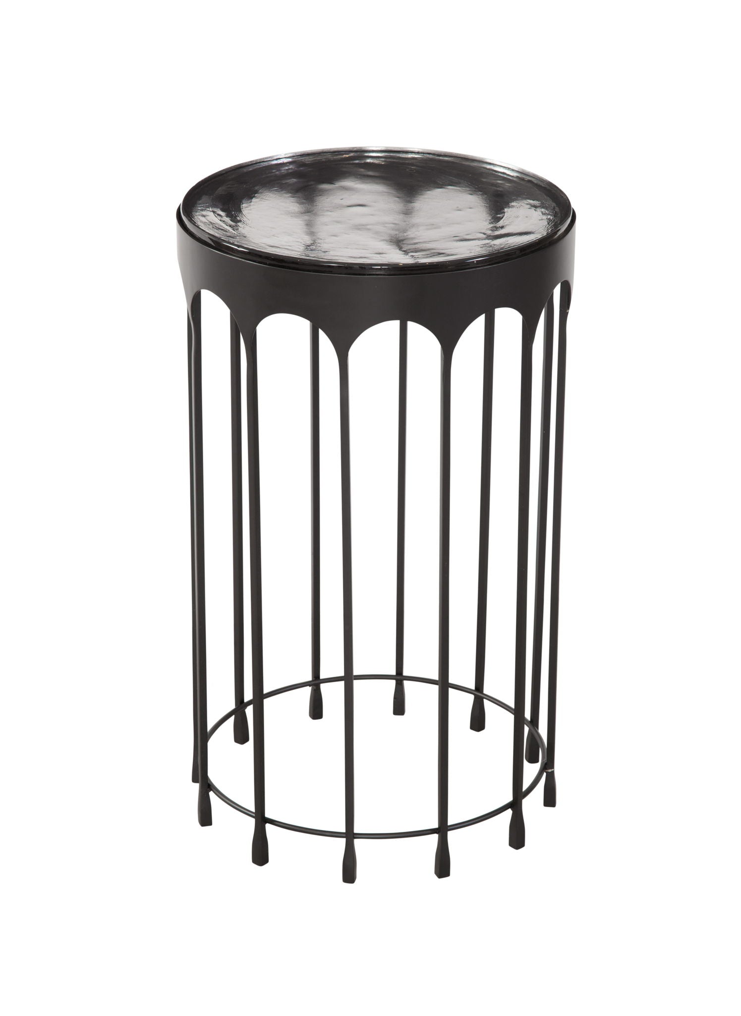 Introducing the Hartley Accent Table in sophisticated black contemporary style. Crafted with a thick, round cast glass top and a matte black iron base with an elegant arched design motif, this table adds a touch of modern elegance to any space. With its quality construction and unique design, it stands as a sleek and stylish addition to your home decor, requiring no assembly for effortless placement.