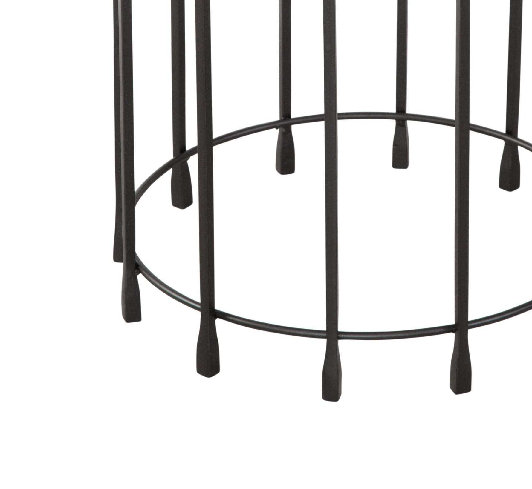 - Constructed with a thick, round cast glass top and a matte black iron base