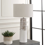 • The Haven Table Lamp Combines Elegance With A Touch Of Rustic Charm. This Piece Features A Sleek Ceramic Base Cloaked In A Smooth White Glaze, Adorned With Subtly Ribbed, Distressed Accents, All Complemented By Brushed Plated Nickel Hardware For A Refined Finish.