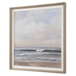 This Serene Depiction Of A Coastal Scene Features A Soft, Muted Color Palette Of Moody Blues, Grays, And Beige, Capturing The Gentle Waves And A Calm, Cloudy Sky. A White Linen Liner And Gray Washed Pine Frame Complement The Design. Artwork By Silvia Vassileva.