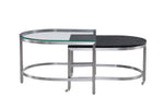 Meet the Hensley Cocktail Table, a stylish representation of glam-inspired design. This two-piece nesting table set features half-oval shaped frames in a satin-nickel finish, adding a touch of sophistication to your living area. The taller table is adorned with a clear, tempered glass top, while the nesting table showcases a beautiful black marble top. With added casters for easy movement, the Hensley Cocktail Table combines both elegance and practicality, making it a fine addition to your home decor.
