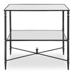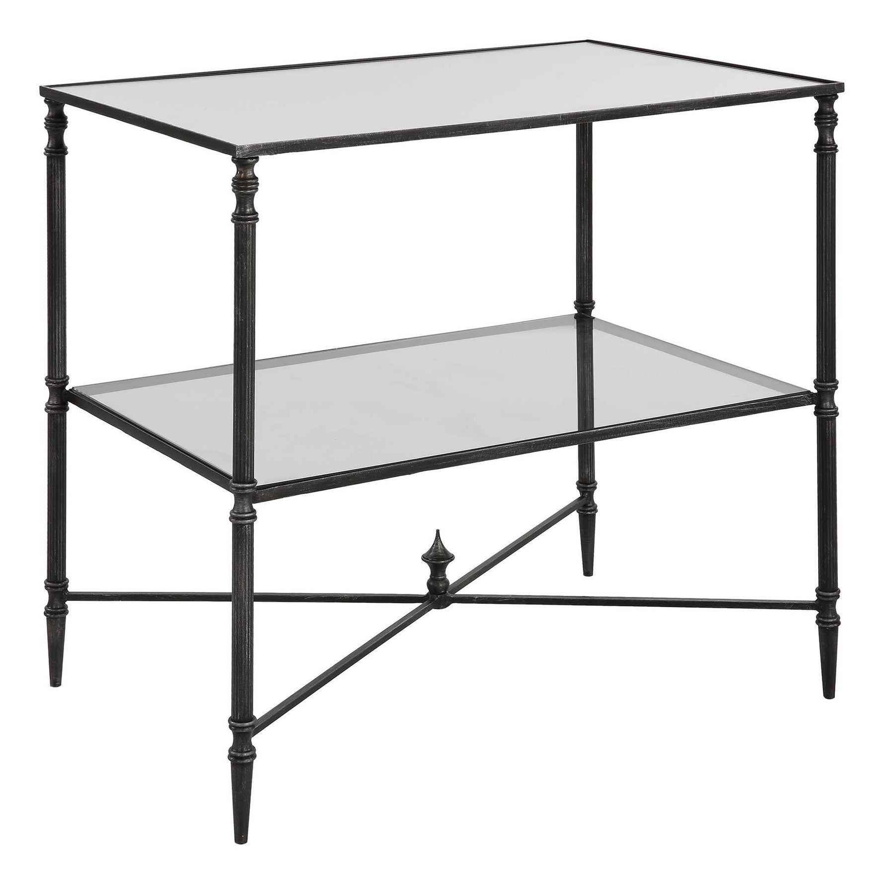 - An Elegant Silhouette In Iron With A Cross Stretcher Accent Finished In Blackened Steel With Silver Highlights. Top Is Reinforced Mirror And Gallery Shelf Is Clear Tempered Glass.