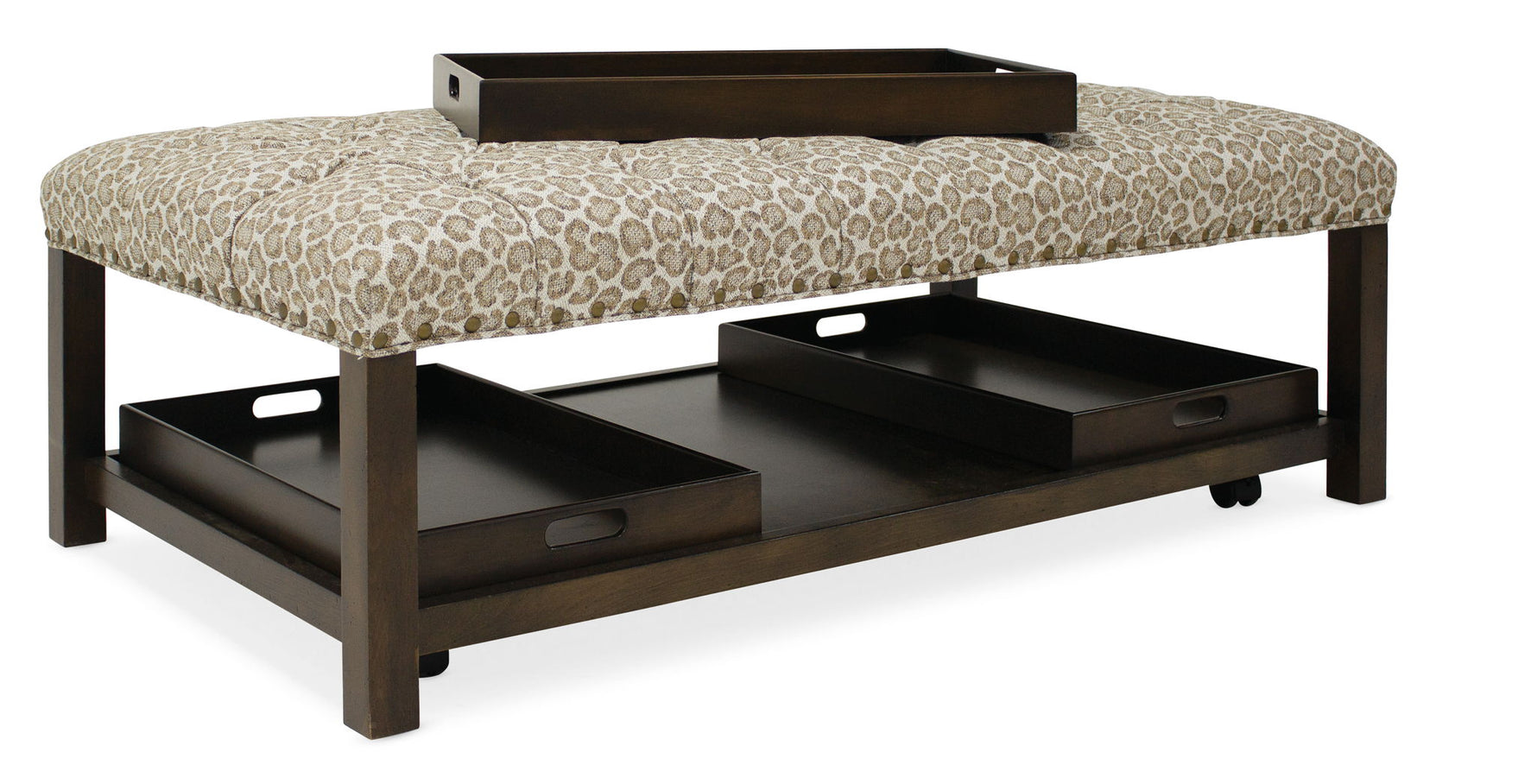 Unit price perIntroducing what we truly do best – great design, intricate, multi-step hand finishes and on-trend fabric offerings – to the occasional furniture category, the highly customizable Cocktails & More program offers a variety of options on eight upholstered cocktail tables, each of which include cocktail trays and casters. Available in round, square, oval or rectangle, the upholstered cocktail ottomans are available in a choice of more than 650 fabric options with tufted or non-tufted tops and a choice of eight finishes. An additional 15 Premier finishes – hand applied by our artisans – are also available, along with contrasting welt options and a choice of two sizes of nail-head detailing, available in four different finishes for further customization. Melding form with function, each style includes complementary solid wood serving trays for use in entertaining and hidden, locking casters for easy movement. The solid wood trays are crafted to nest on the cocktail ottomans’ bottom shelf for storage when not in use. Strategically placed wooden positioning pins on the bottom shelf help to lock the trays in place.