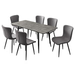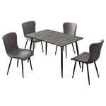 This modern dining set pairs a versatile dining table with sleek dining chairs for a cohesive and contemporary look. The dining table features a 15. 75-inch butterfly leaf, extending from 47. 25 to 63 inches to accommodate guests with ease. Its HD melamine tabletop over MDF offers a scratch- and water-resistant surface, supported by black powder-coated metal tapered legs. Complementing the table are grey linen-like upholstered dining chairs, designed with contoured backrests, foam-padded seats, and sturdy black powder-coated metal legs for comfort and style.