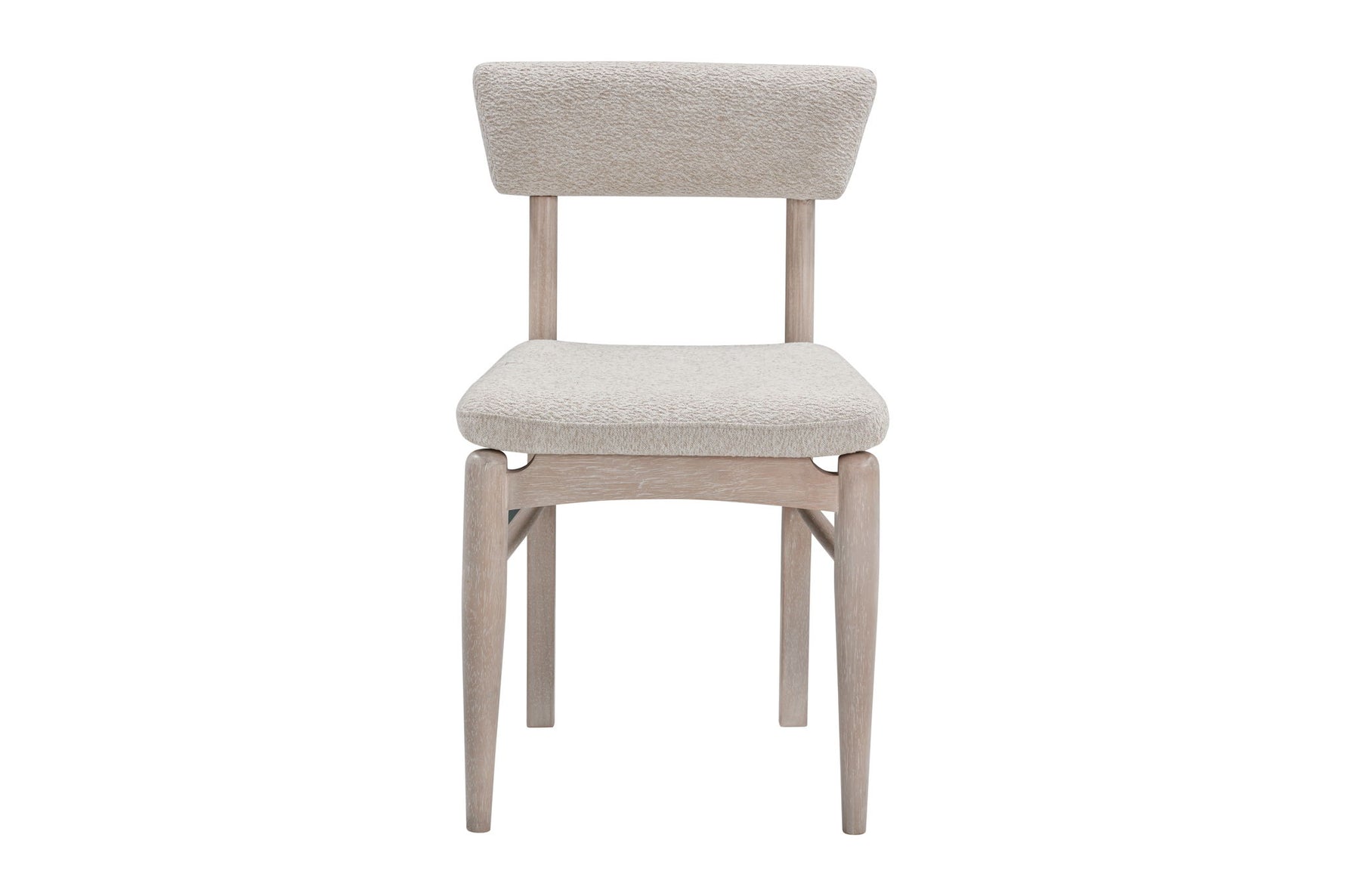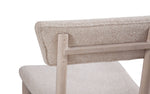 The Horizons Dining Chair is a seamless blend of modern design and coastal aesthetics with its cerused white oak finish and taupe fabric. Crafted with an open back design, it offers a blend of sophistication and comfort. The easy-to-clean 100% polyester boucle fabric in taupe ensures practicality without compromising on style. With its soft shaping and cerused oak finish featuring a white glaze in the grain, this chair seamlessly integrates into any space.