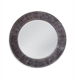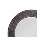 Hunter Wall Mirror is round framed in a rustic weathered gray finish with a planked design.