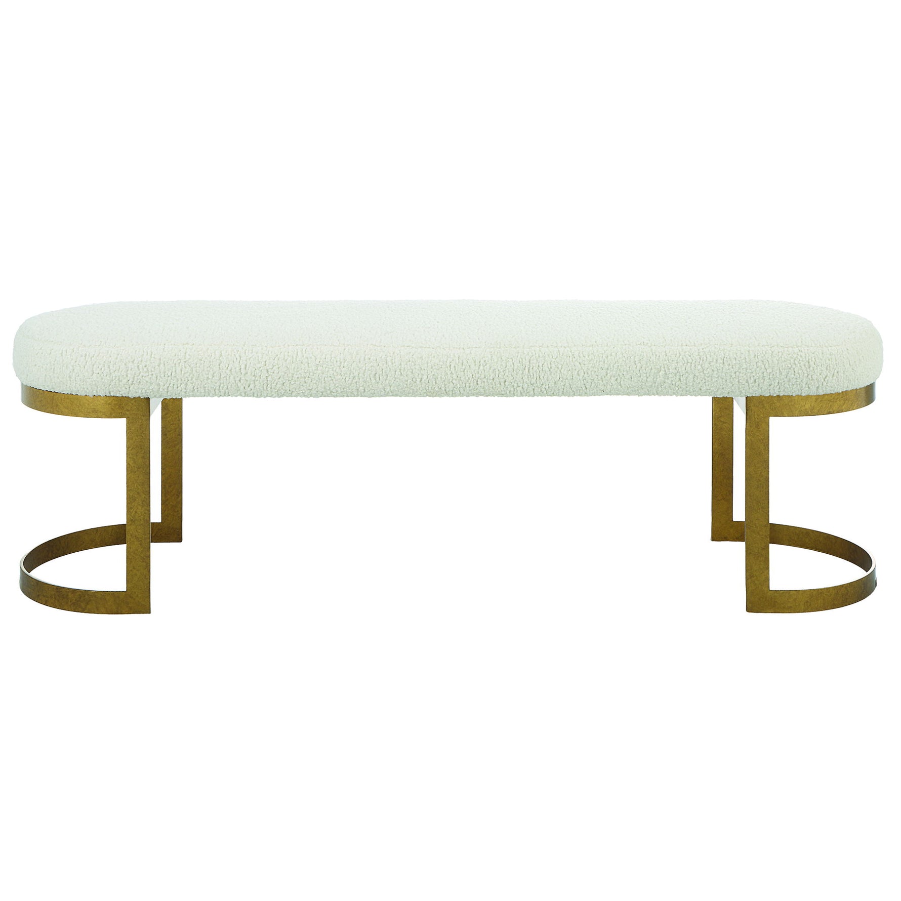 - Merging Simplicity With Style, This Bench Features A Thick Hand Forged Iron Base Finished In Mottled Antique Gold Leaf. The Plush Seat Is Upholstered In Natural Faux Shearling Fabric.