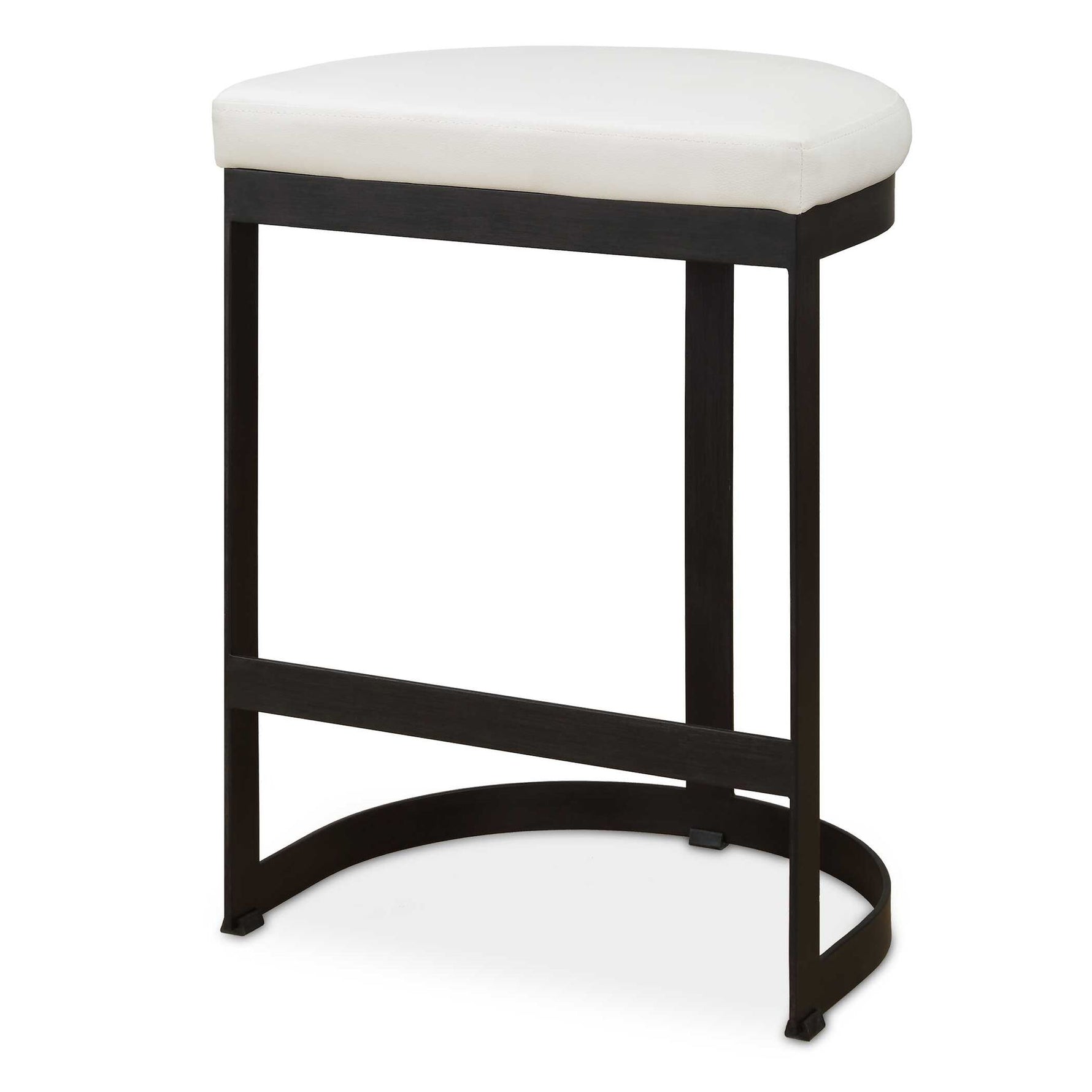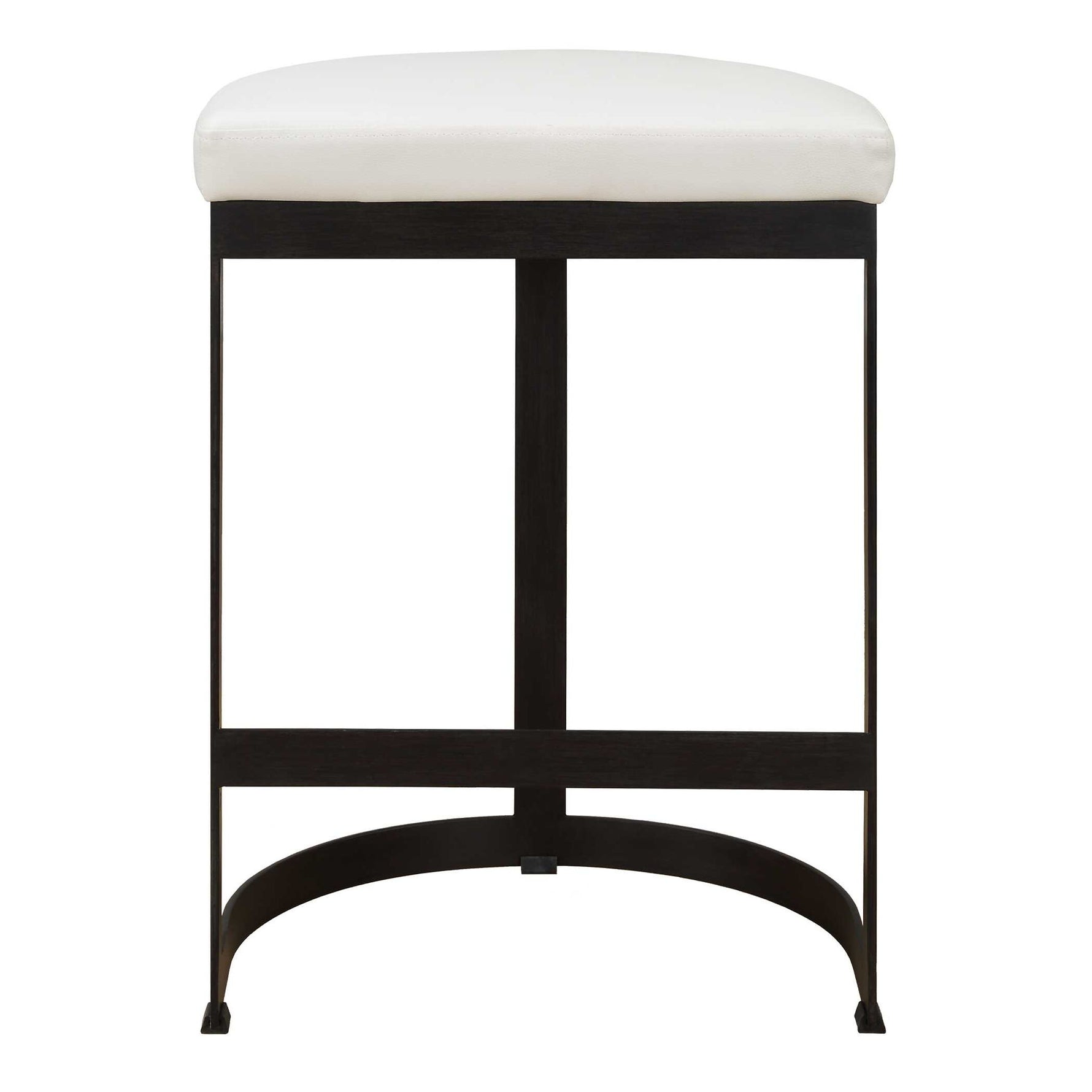 - Simplistic But Sturdy, This Statement Counter Stool Features A Thick Hand Forged Iron Base Finished In Matte Black. Plush Seat Is Tailored In A White Pebbled Faux Leather.