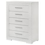 Organize your wardrobe in style with this contemporary chest. The high gloss finish and 3-dimensional diamond tile emboss provide a chic, modern look that enhances any bedroom decor. Five spacious drawers offer ample storage for clothing and linens, each with felt lining in the top drawers to protect your delicate items. The chest is built with robust materials and English dovetail joinery, ensuring durability and smooth functionality. This piece is both practical and stylish, perfect for a modern home.