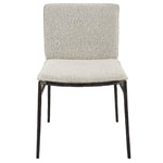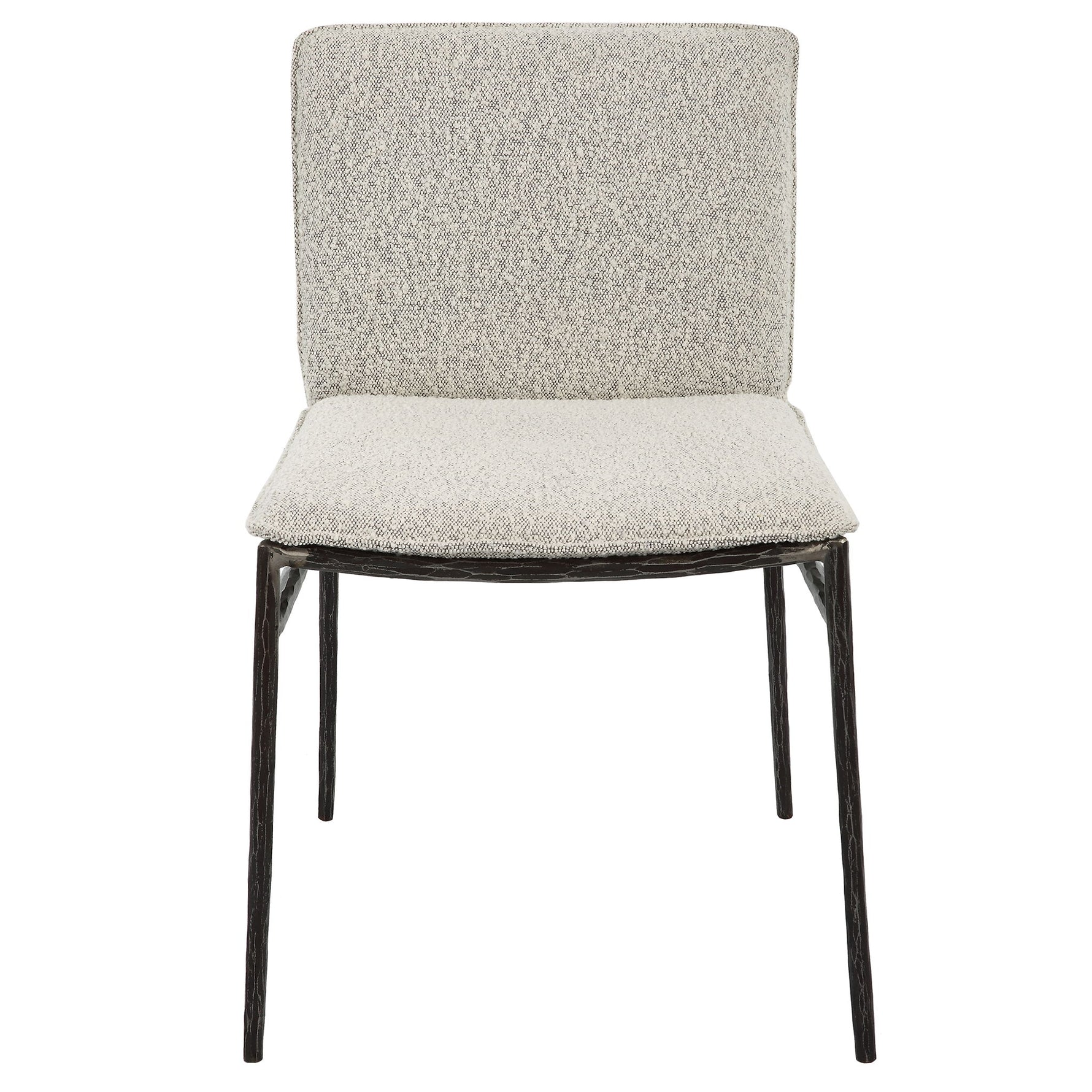 Inspired By Contemporary Designs, The Jacobsen Dining Chair Showcases Curved Lines With A Chiseled Iron Frame In A Natural Aged Black Iron Finish. A Casual Ivory And Warm Gray Boucle Fabric Accents This Modern Look.