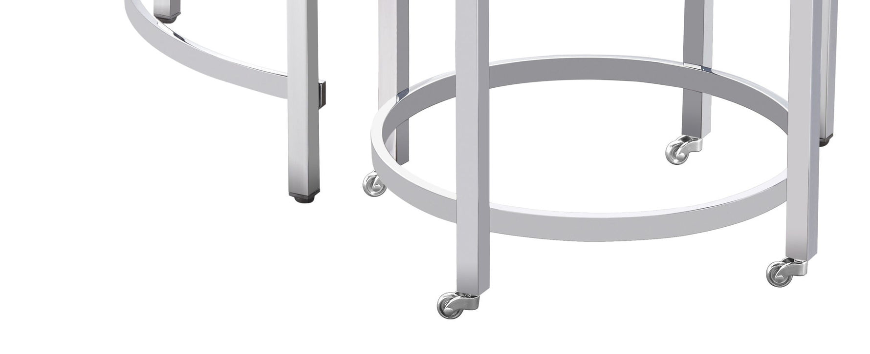 The Jadyn Round Cocktail is a round cocktail table with a white marble top and chrome base housing a smaller nesting table with a glass top, chrome base and piano casters.