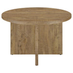 Build a stylish dining room or kitchen around this charming contemporary round dining table. It features a familiar silhouette with a bold X-cross base design that adds movement and geometric influence to the look. The table features a stylish mango wood finish that's rich in texture and dimension, perfect for modern or farmhouse settings. The table easily seats four, making it an ideal choice in a family kitchen or breakfast nook, or in your compact dining room. The base features solid planks for a robust look and feel that offers the perfect touch of gravitas to casual dining spaces.