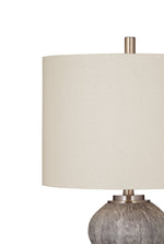 The Jed Table Lamp is crafted of polyresin in a Cream and Dark gray finish with a natural linen drum shade. Finished in an Antique Leather look.