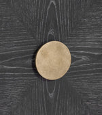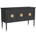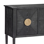 The Jensen Console table brings a modern glam style to the home. Constructed with rubberwood solids and flat-cut, cerused oak finished in a black stain. The open grain finish features generous white wax hang-up. The dark wood is accented with hand-padded gold leaf finished panels and hardware, which tie back to the bronze finished foot caps on each piece. This server features three doors with a single adjustable shelf behind each providing ample storage.