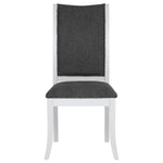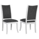 Dimensional gray upholstery creates engaging contrast and depth for this set of two modern dining chairs. Each boasts a tall, refined silhouette that's armless to create a smooth, streamlined silhouette. Cushions are padded with foam and covered in dark gray upholstery. A pearl white finish adds crisp, clean character, delivering a look that works beautifully in a variety of spaces and decor styles. Chairs are complete with flared front legs and squared edges that encourage a clean, precise look.