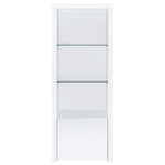 Extend a media console or add easy display space in a den or bedroom with this contemporary tower. Designed to accompany the matching media console, the tower adds a lower cabinet with shelving inside, and a pair of glass display shelves. It’s the perfect solution when both hidden and accessible storage are desired. A crisp white finish adds to the modern look and complements virtually any space. Melamine paper surfaces are designed for durability, perfect for everything from games and media to charming decor.